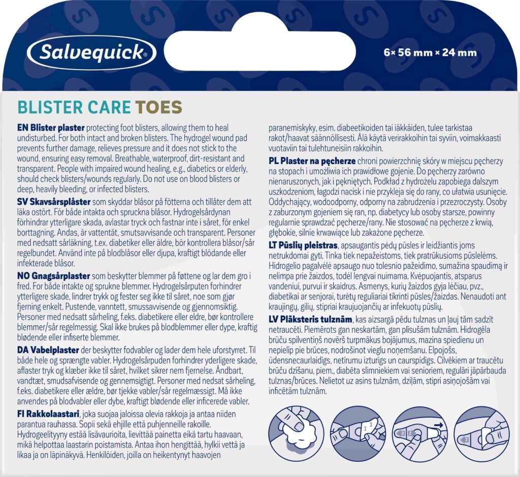 Blister Care Toes is a blister plaster that protects blisters and allows them to heal undisturbed while providing instant pressure relief. The soft hydrogel pad prevents further damage and does not stick to the wound, ensuring easy and pain-free removal.