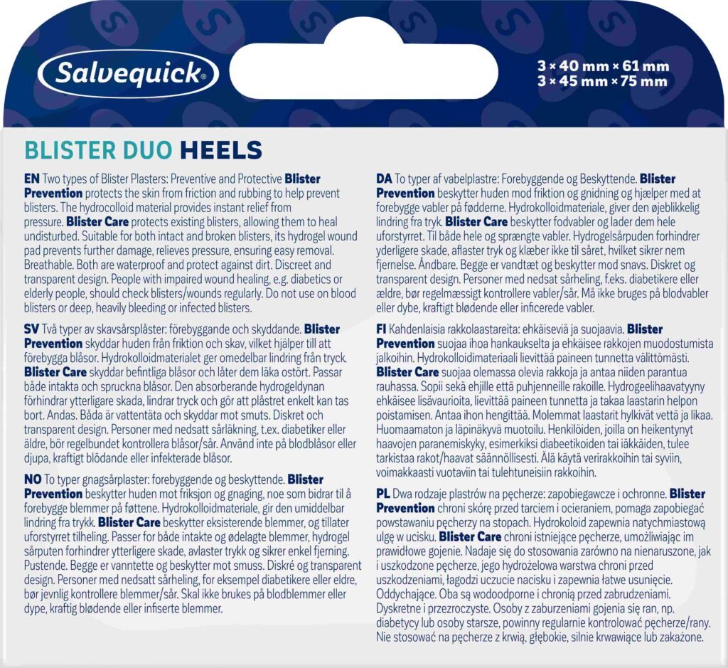 Blister Duo contains two types of blister plasters: one for prevention and one for protection. A complete solution for both avoiding blisters and caring for them when they occur.
